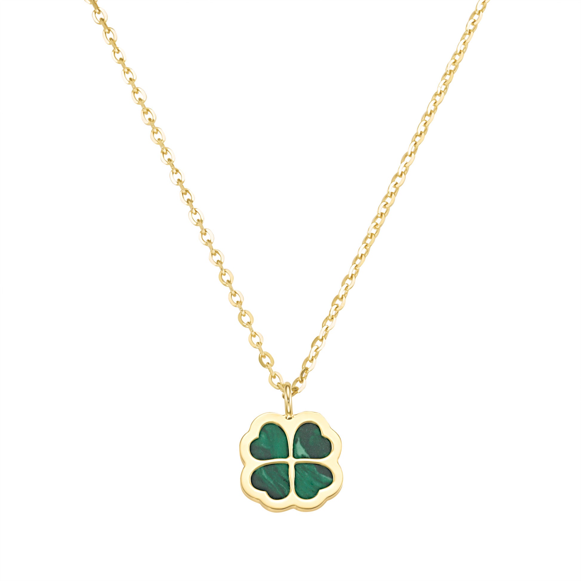 Anhänger Kleeblatt GG 375/- glanz, Karabiner, Länge 40 + 2 cm Verlängerungskette, 1 Malachit Kleeblatt-Form, Maße L x B ca. 11 x 8,2 mm, Ankerkette diamantiert Breite ca. 1,1 mm